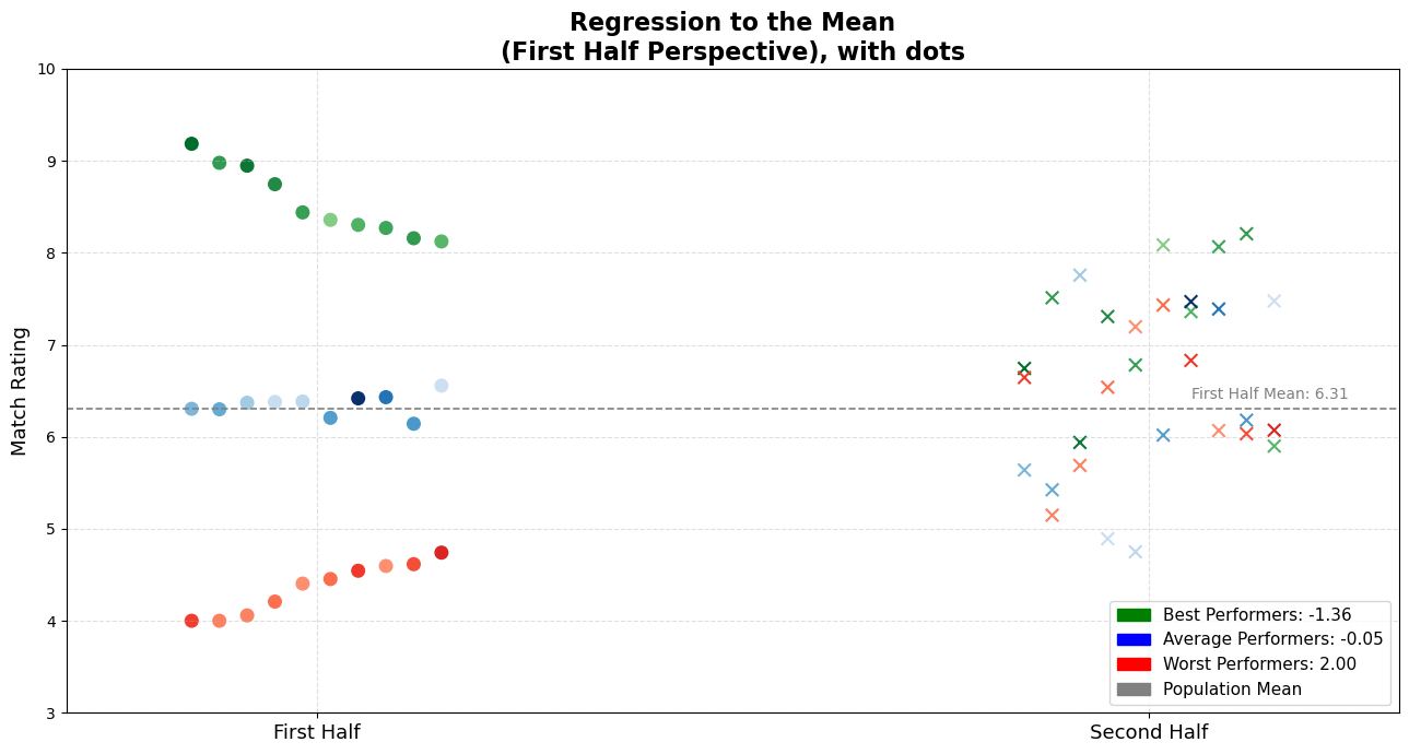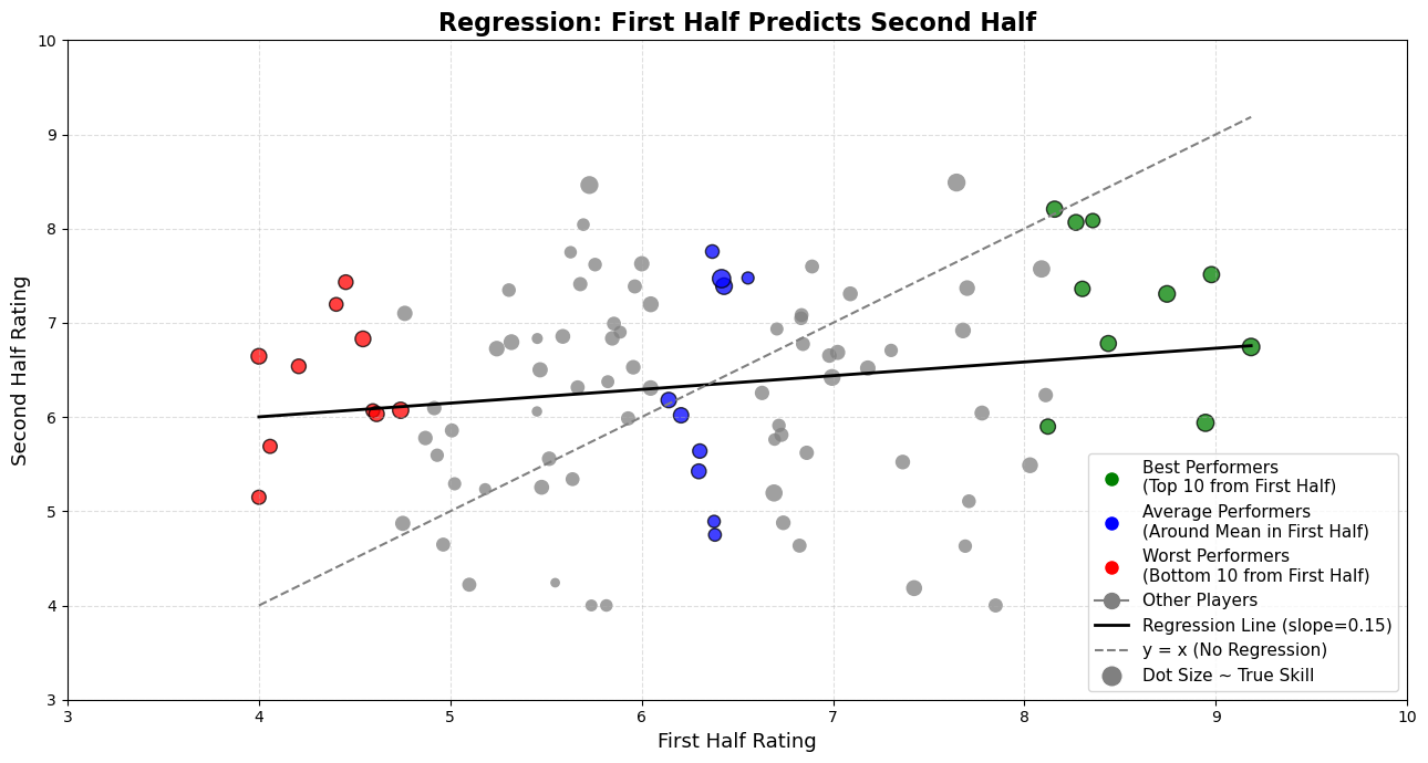 Specifically, if we take each player’s first-half rating as an independent variable (predictor) and second-half rating as the dependent variable (outcome), we typically see a regression slope less than 1. In a perfectly consistent world, the dots would fall on a 45-degree diagonal line — where every extreme performance repeats itself. That diagonal has a slope of 1.