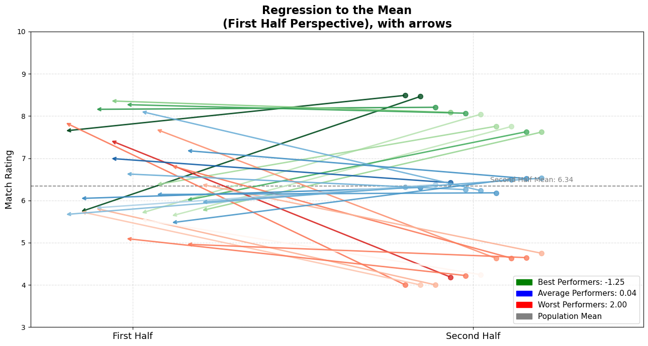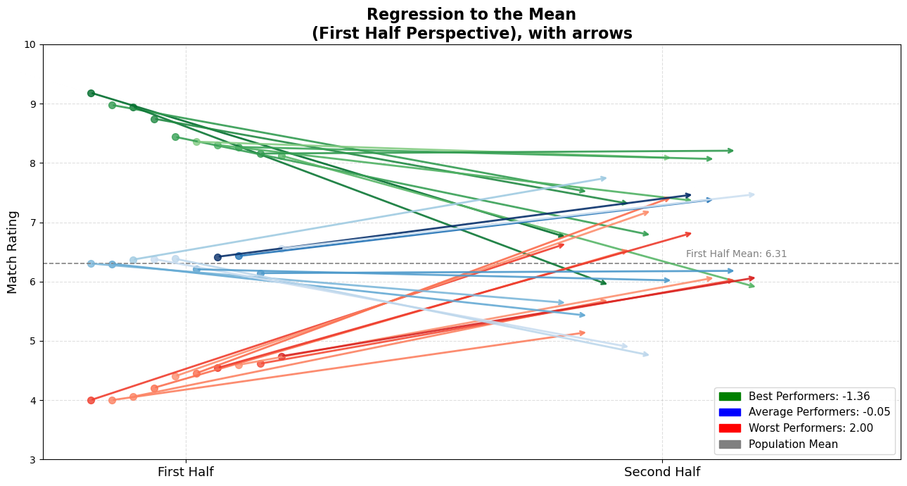 I know — it’s a simple simulation. It can’t possibly capture the chaos, tactics, emotions, and complexity of real football. This isn’t about predicting player performance. But, we’re discussing only the statistical regularity. Even here, in this modest model, do you notice the same pattern? Best performers decline, averages can go any way so that they balance in average, and worst performers improve.