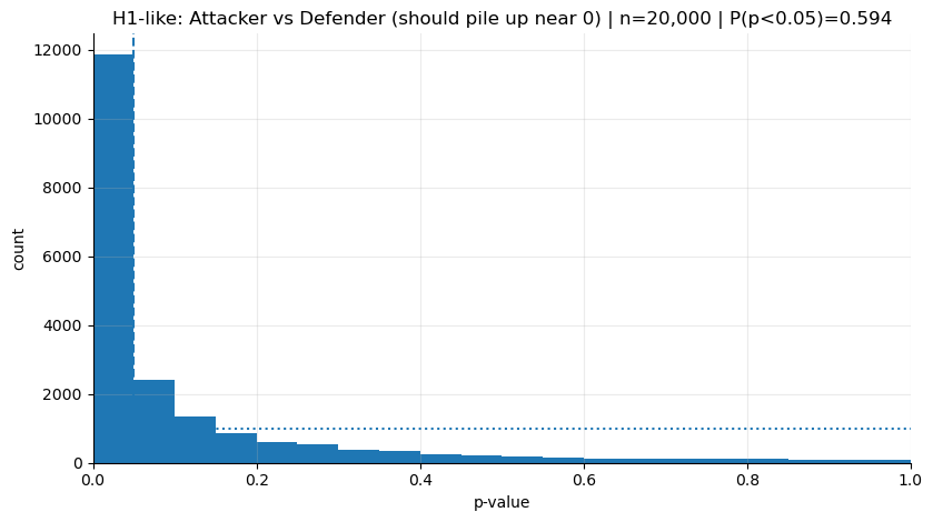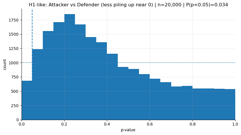 plot_hist(p_h1, "H1-like: Attacker vs Defender (should pile up near 0)")H1-like P(p<0.05): 0.5935
