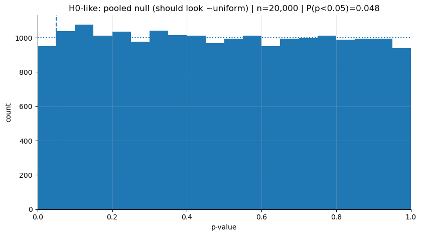 plot_hist(p_h0, "H0-like: pooled null (should look ~uniform)")H0-like P(p<0.05): 0.04755